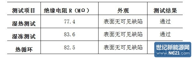 隨機抽取1塊此工藝下焊接的組件進行環境老化測試,根據IEC61215設計鑒定與定型10.13,10.12,10.11測試方法,測試結果如表1所示,組件外觀無異常,且濕絕緣合格。